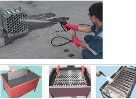 電場清洗使用非酸性的洗滌用品,可以使用強性的火堿作稀釋后作為油污清洗劑使用,浸泡好然后用高壓水槍加清水沖洗,放置在干凈的地方完全晾干。